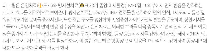 따라서, 온열치료와 방사선치료의 병행이 면역 억제성 종양 미세환경(TME)을 면역 자극성 환경으로 전환할 수 있는지 등 면역학적 잠재력을 확인하기 위한 연구자들의 추가 연구와 탐구가 매우 중요하다. 이는 결국 혁신적인 암 치료법에 한 걸음 더 다가가는 희망이 될 것이다.