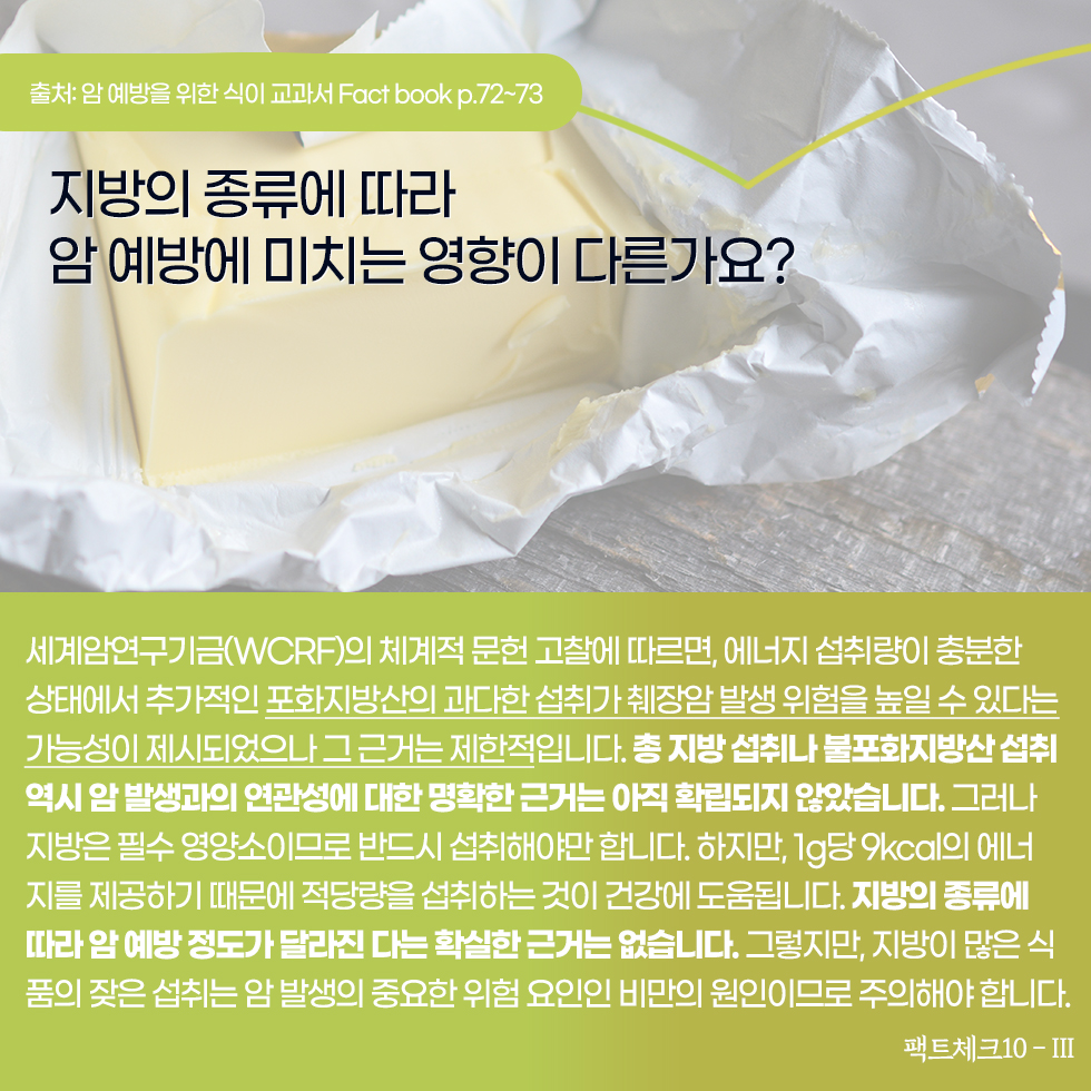 세계암연구기금(WCRF)의 체계적 문헌 고찰에 따르면, 에너지 섭취량이 충분한 상태에서 추가적인 포화지방산의 과다한 섭취가 췌장암 발생 위험을 높일 수 있다는 가능성이 제시되었으나 그 근거는 제한적입니다. 총 지방 섭취나 불포화지방산 섭취 역시 암 발생과의 연관성에 대한 명확한 근거는 아직 확립되지 않았습니다. 그러나 지방은 필수 영양소이므로 반드시 섭취해야만 합니다. 하지만, 1g당 9kcal의 에너 지를 제공하기 때문에 적당량을 섭취하는 것이 건강에 도움됩니다. 지방의 종류에 따라 암 예방 정도가 달라진 다는 확실한 근거는 없습니다. 그렇지만, 지방이 많은 식 품의 잦은 섭취는 암 발생의 중요한 위험 요인인 비만의 원인이므로 주의해야 합니다.