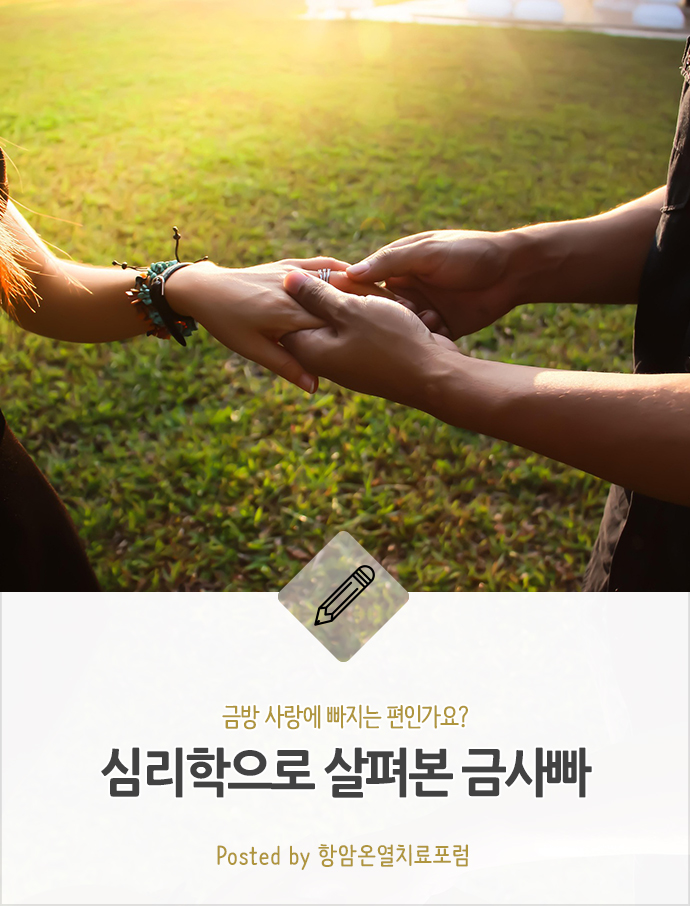 누구나 처음 만난 사람에게 금세 마음이 끌리는 경험을 해본 적이 있을 겁니다. 그 사람이 운명의 상대라고 생각하거나, 그 어느 때보다 빠르게 사랑에 빠지기도 하죠. 이런 일이 어쩌다 한두번 일어날 수 는 있지만, 만약 사랑에 빠지는 짜릿함을 쫓고, 급속도로 사랑에 빠지는 경험을 자주 한다면, 금사빠(Emophilia)일 가능성이 있습니다.