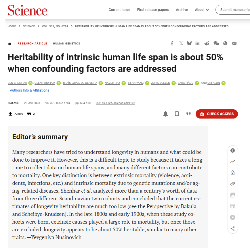 이번 연구의 제1 저자인 Ben Shenhar(이스라엘 바이츠만 과학연구소 연구원)는 기존의 쌍둥이 및 가족 연구는 19세기 후반과 20세기 초반에 태어난 사람들의 데이터에 크게 의존했는데, 당시에는 감염, 사고, 폭력, 자연재해 등 생물학적 노화와 무관한 원인으로 인한 사망률이 오늘날보다 10배나 높았다는 점을 꼬집었습니다.