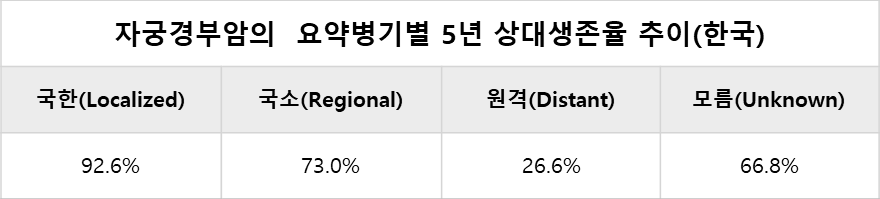한편, 미국국립암연구소에서는 SEER(Surveillance Epidemiology and End Results) 프로그램을 통해 "요약병기(Summary Stage)"라는 병기 분류를 개발했습니다. 요약병기는 암이 그 원발 부위로부터 얼마나 퍼져있는지를 범주화한 기본적인 분류 방법으로그 병기 분류에 따른 5년 상대생존율은 다음과 같습니다.