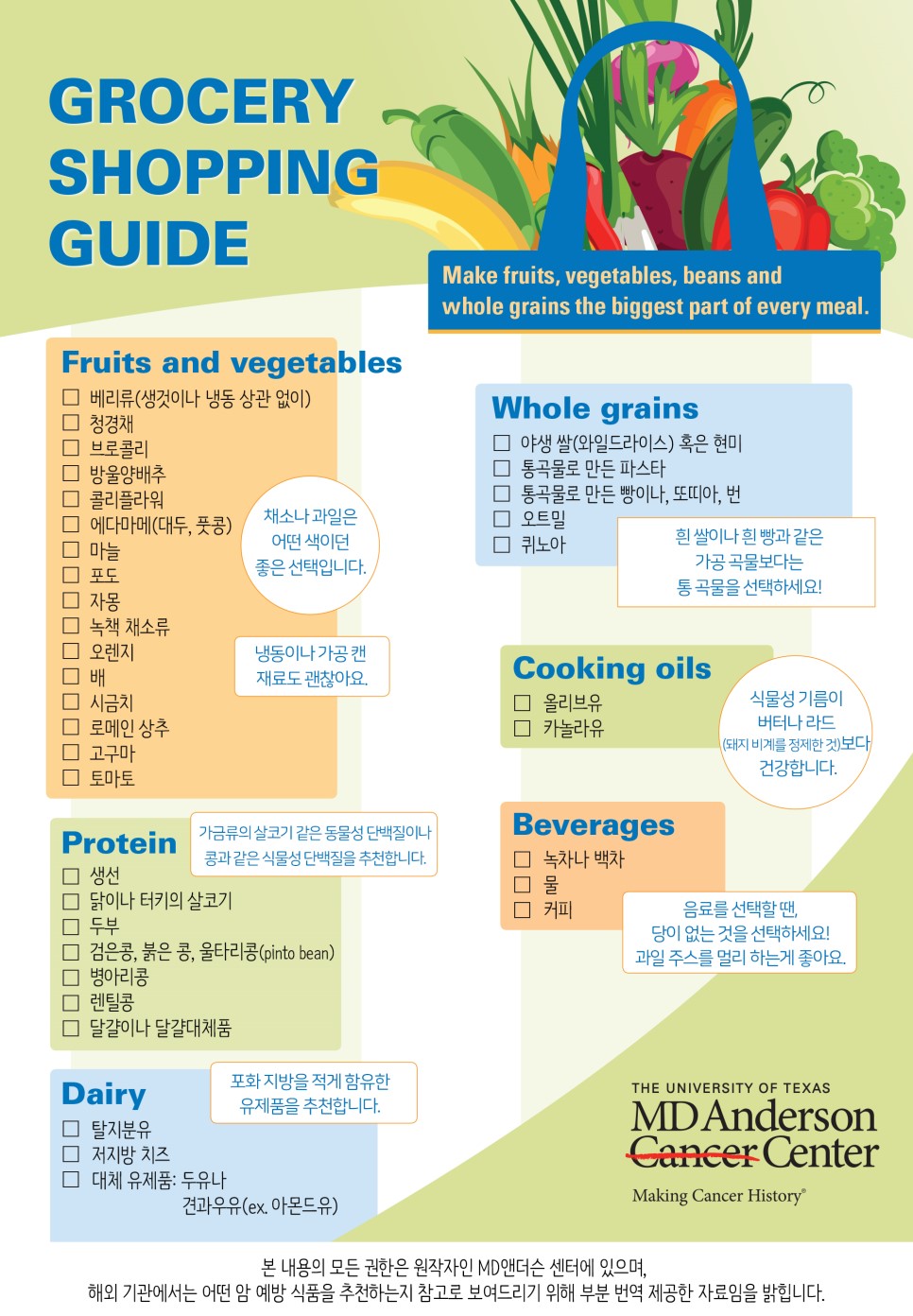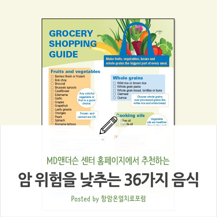 아래의 리스트는 MD Anderson 센터 홈페이지에서 제안하는 암 예방 장보기 리스트를 번역한 것입니다.