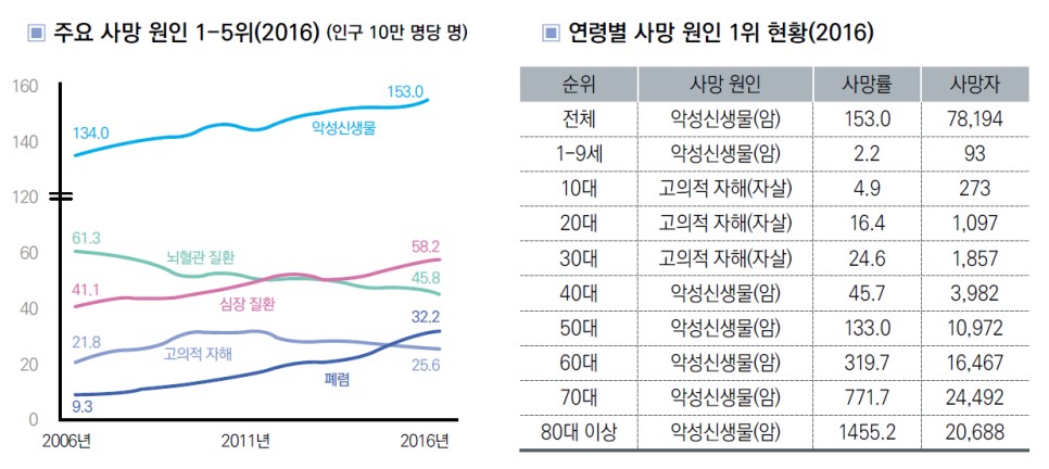 2016년 연령별 사망 원인 1위를 살펴보자면, 10~30대를 제외하면 질병에 의한 사유가 가장 큽니다.
