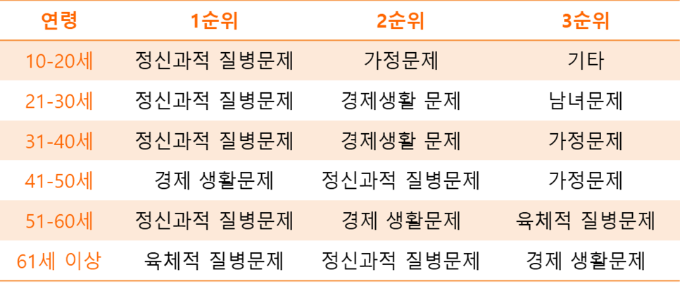 중앙자살예방센터, 2018자살예방백서에 수록된 연령에 따른 동기별 자살현황을 살펴보자면, 50대 이상에서는 육체적 질병이 세 손가락안에 꼽히는 사유인 것으로 나타났습니다. (자살 동기 10가지 사유중 10대~30대 :6위를 차지 했지만 40대에서부터 4위의 사유로 상승하는 것을 볼 수 있었습니다.) *정신과적 질병 문제에는 우울증이 포함됩니다.