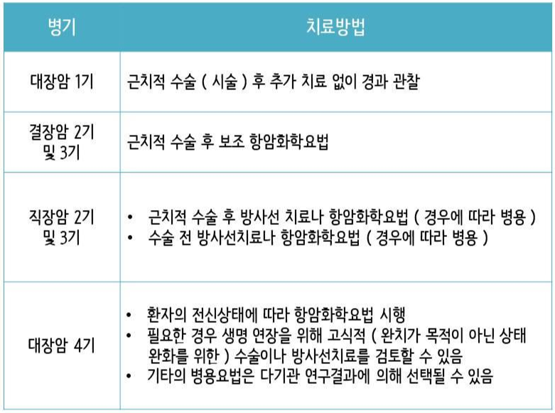대장암은 결장암과 직장암으로 구분하는데요. 대장암을 치료하는 방법에는 크게 수술요법, 항암화학요법, 방사선요법, 표적치료, 면역요법 등이 있습니다. 위에 나열한 방법으로 단독 혹은 병합되어 사용되고 있습니다. 대장암의 병기별 치료방법에 대해 알아보겠습니다.