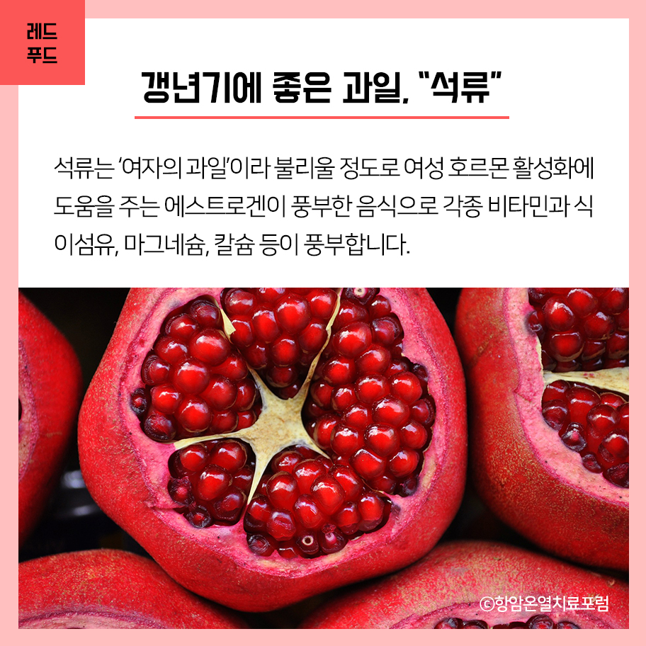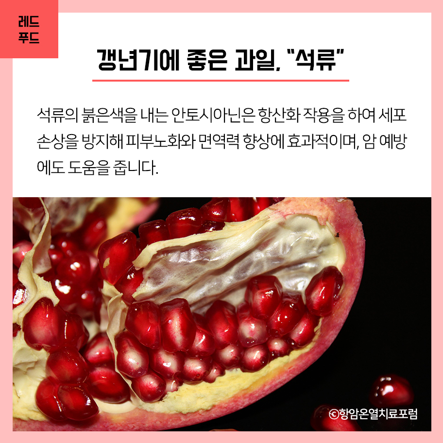 석류는 ‘여자의 과일’이라 불리울 정도로 여성 호르몬 활성화에 도움을 주는 에스트로겐이 풍부한 음식으로 각종 비타민과 식 이섬유, 마그네슘, 칼슘 등이 풍부합니다. 석류의 붉은색을 내는 안토시아닌은 항산화 작용을 하여 세포 손상을 방지해 피부노화와 면역력 향상에 효과적이며, 암 예방 에도 도움을 줍니다.