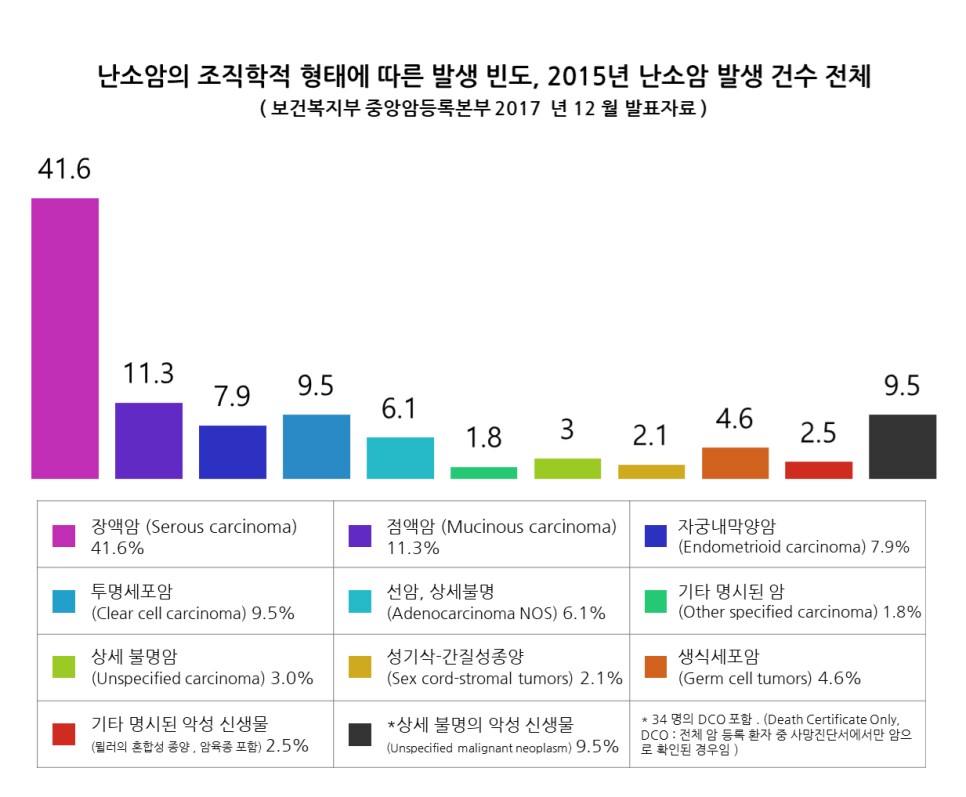 조직학적으로는 2015년의 난소암 전체 발생 건수 2,443건 가운데 암종(carcinoma)이 81.2%, 생식세포종양이 4.6%를 차지했습니다. 암종 중에서는 장액암이 41.6%로 가장 많았고, 그 다음으로 점액암이 11.3%를 차지했습니다.