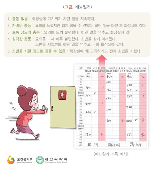 배뇨일기를 작성하여 하루에 몇번 화장실을 가는지, 야간뇨는 몇 번을 보는지 등을 일기를 작성해보세요.
