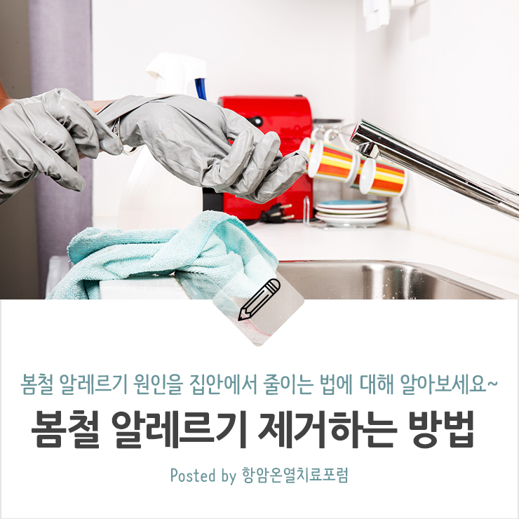 집안 곳곳에 쌓인 먼지, 화장실과 주방 등에 생기는 곰팡이, 밖에서 유입되는 먼지, 꽃가루 등 알레르기를 유발하는 물질들이 집안에 가득합니다. 집안 청소로 알레르기 발생률을 줄일 수 있습니다. 먼지가 쌓인 장식물, 테이블 위, 가전제품 등 먼지가 많은 집안 곳곳을 자주 닦아 먼지가 쌓이지 않게 하는 것이 좋습니다.
