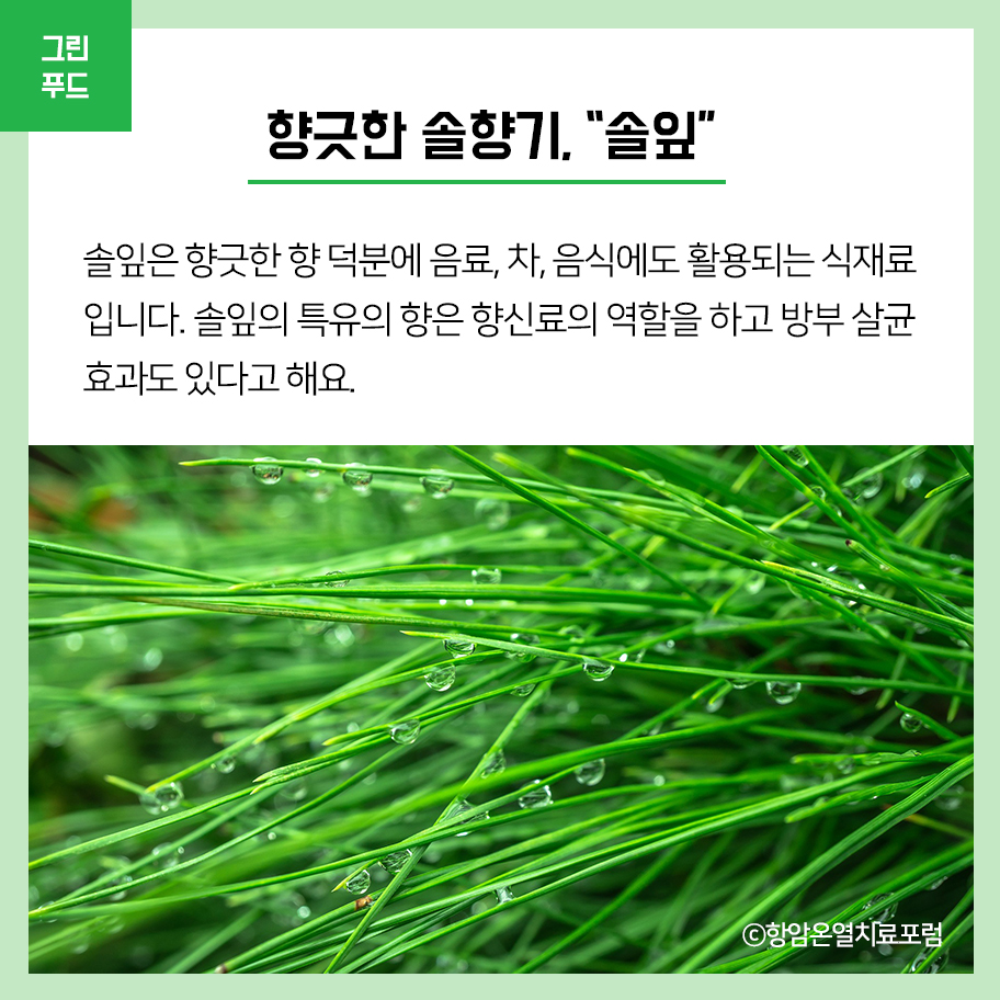 솔잎은 향긋한 향 덕분에 음료, 차, 음식에도 활용되는 식재료입니다. 솔잎의 특유의 향은 향신료의 역할을 하고 방부 살균 효과도 있다고 해요.