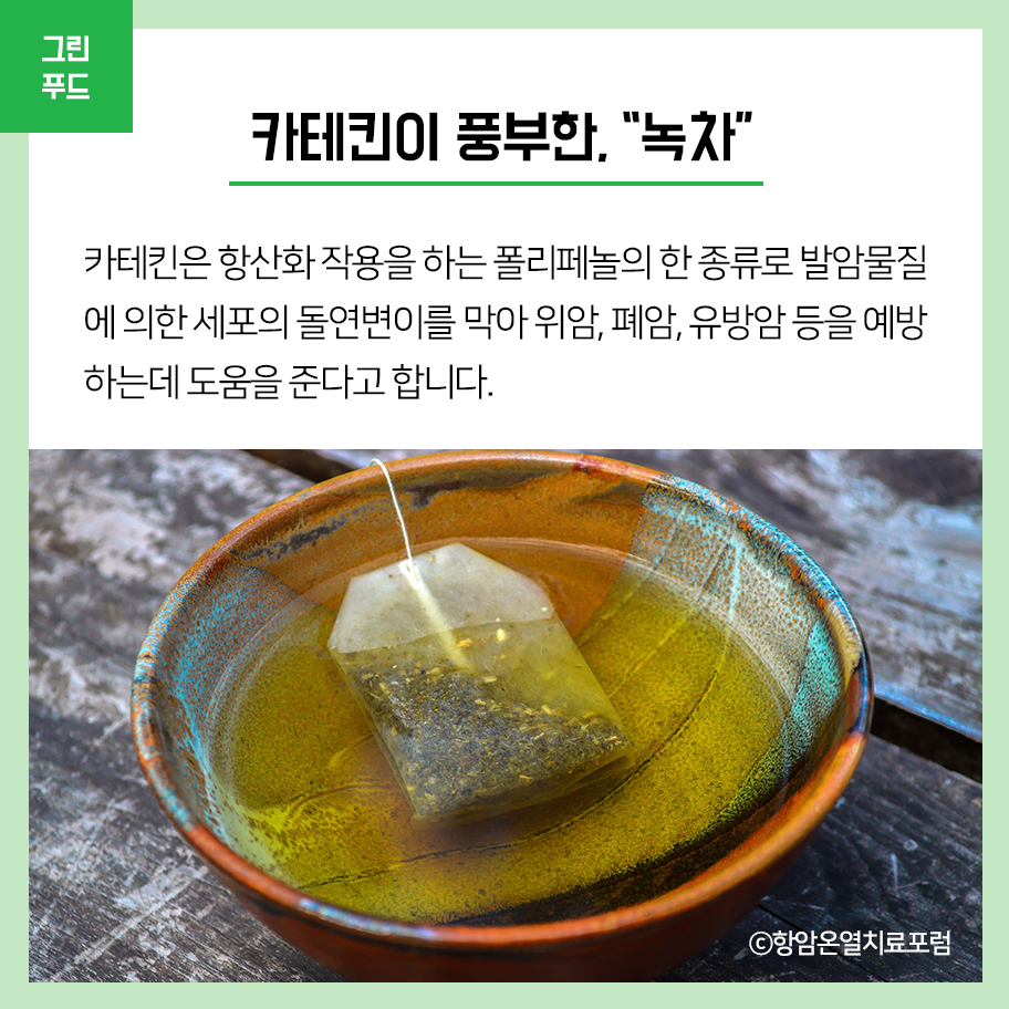 카테킨은 항산화 작용을 하는 폴리페놀의 한 종류로 발암물질에 의한 세포의 돌연변이를 막아 위암, 폐암, 유방암 등을 예방하는데 도움을 준다고 합니다.