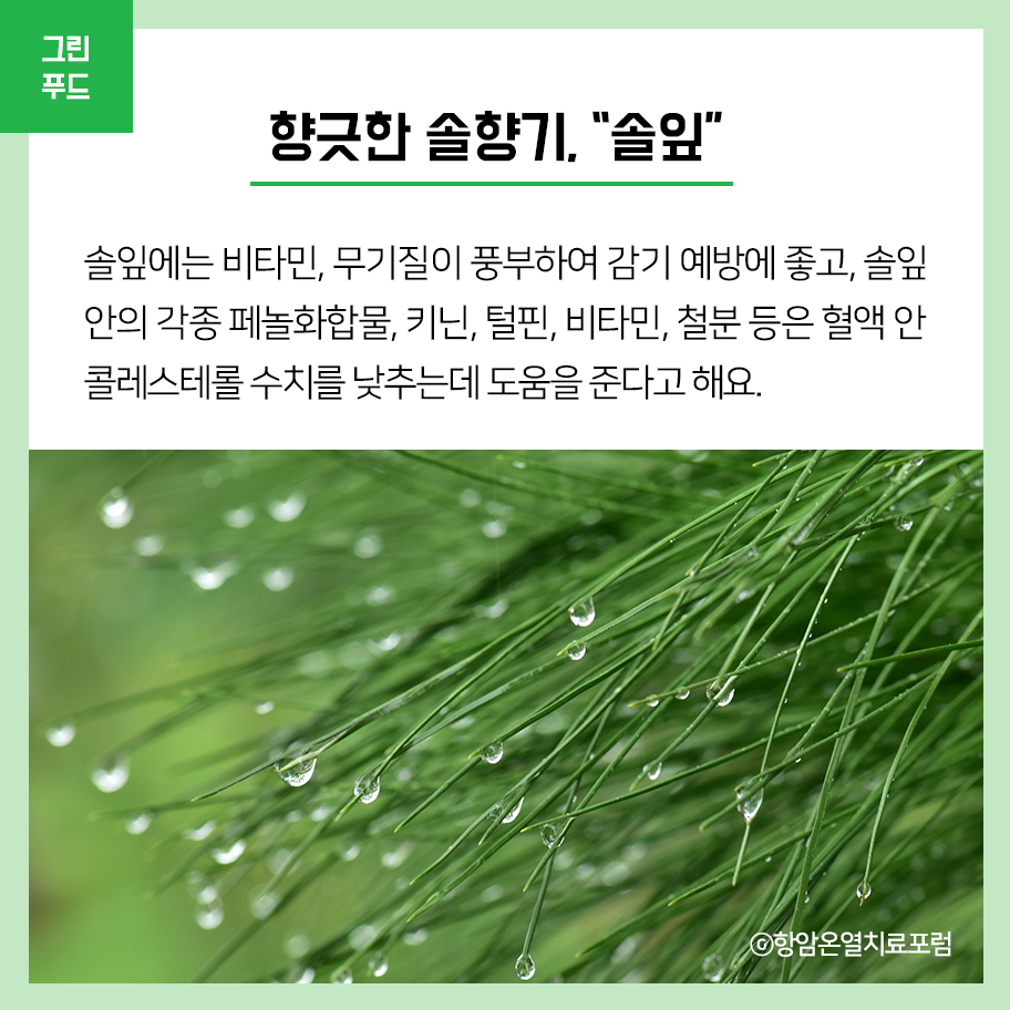 솔잎에는 비타민, 무기질이 풍부하여 감기 예방에 좋고, 솔잎 안의 각종 페놀화합물, 키닌, 털핀, 비타민, 철분 등은 혈액 안의 콜레스테롤 수치를 낮추는데 도움을 준다고 해요.