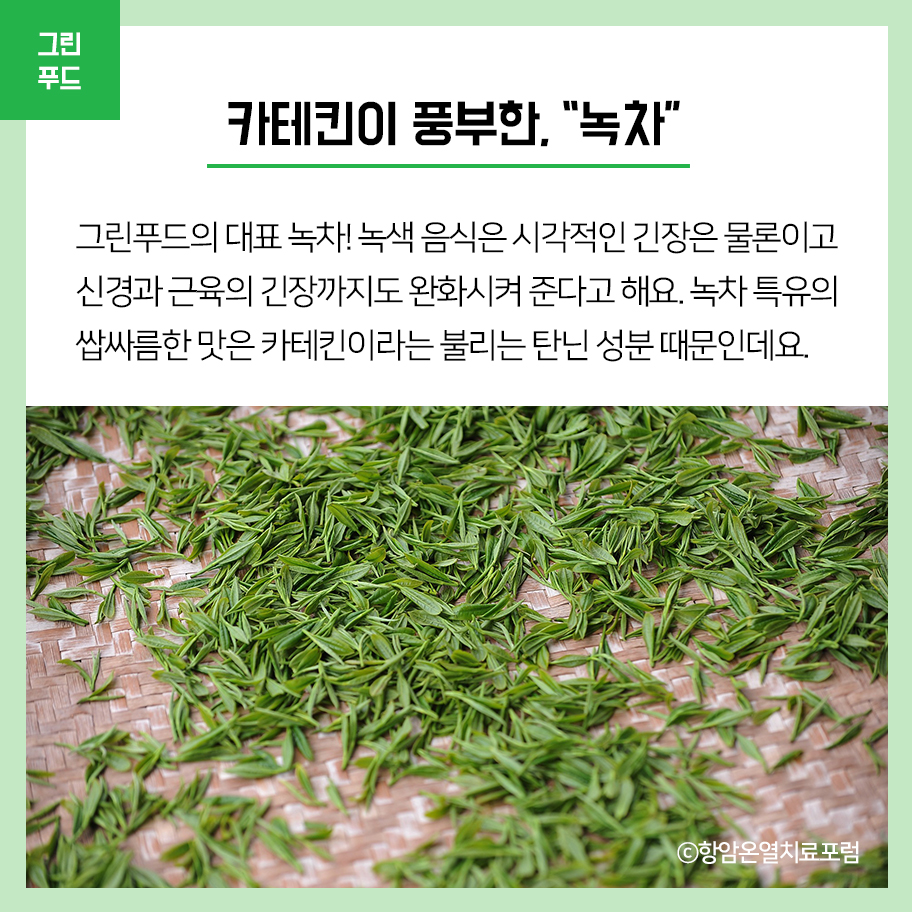 그린푸드의 대표 녹차! 녹색 음식은 시각적인 긴장은 물론이고 신경과 근육의 긴장까지도 완화시켜 준다고 해요.