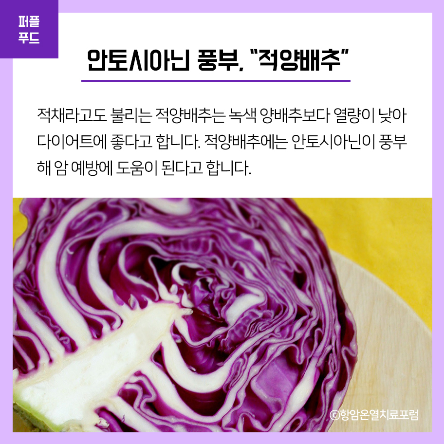 보라색의 적양배추에는 안토시아닌이 풍부해 암 예방에 도움이 된다고 합니다.