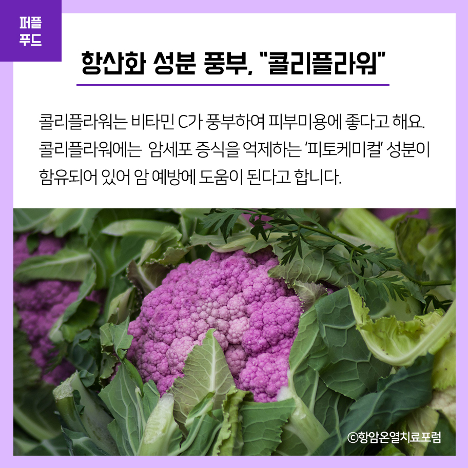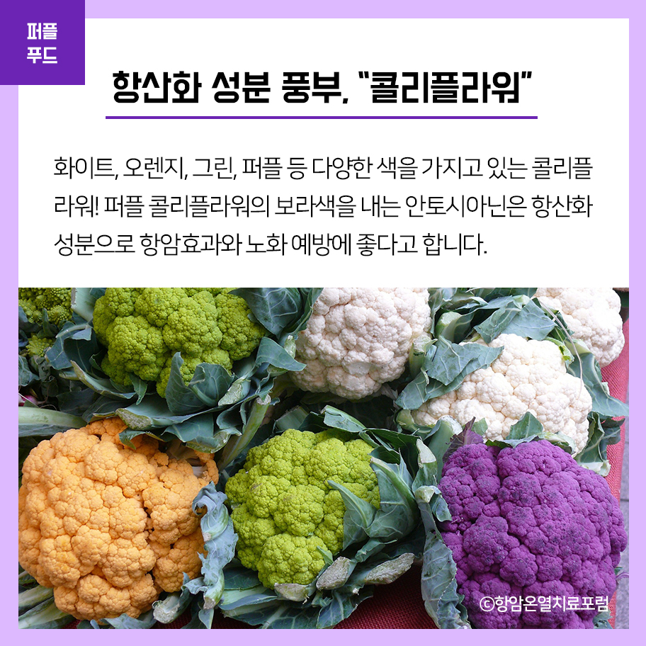 퍼플 콜리플라워의 보라색을 내는 안토시아닌은 항산화 성분으로 항암효과와 노화 예방에 좋다고 합니다.