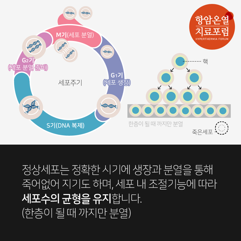 정상세포는 정확한 시기에 생장과 분열을 통해 죽어없어지기도 하며, 세포 내 조절기능에 따라 세포수의 균형을 유지합니다. (한 층이 될 때까지만 분열) 반면, 암세포는 세포주기 조절에 이상이 생겨 무한정 분열하여 과다 증식하게 됩니다. (계속 분열하여 여러층으로 쌓임)