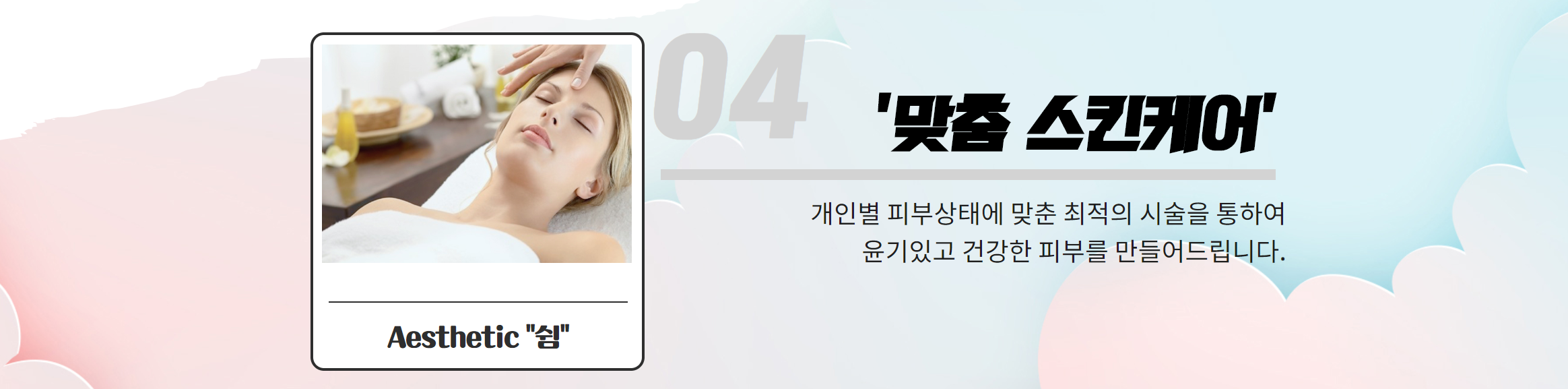 '쉼'에서는 개개인의 피부 타입에 맞춰 미백, 탄력, 보습관리, 고주파관리, 비타민C관리, 진정 관리 등을 받으실 수 있다고 합니다.