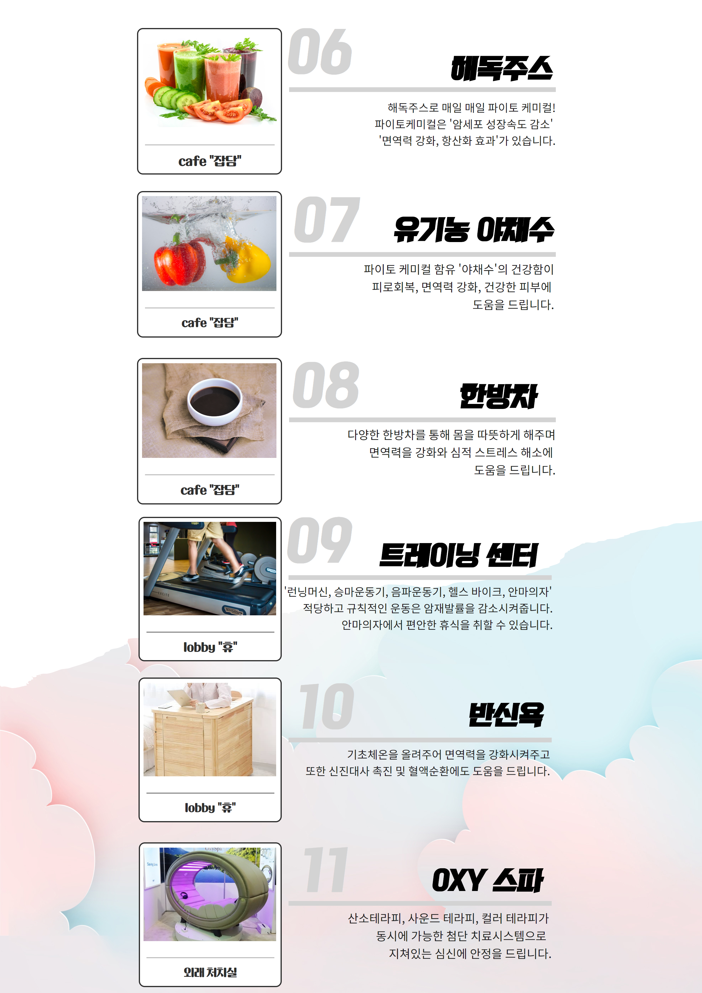 둔산엔젤요양병원의 소확생 휴식공간인 카페 '잡담'에서는 항암 건강식단, 야채수, 항암주스, 한방차, 음료 서비스를 제공하고 있다고 합니다. 그 밖에도 트레이닝 센터, 반신욕, OXY스파 등으로 스트레스 해소와 심신 안정에 도움을 드리고 있습니다.