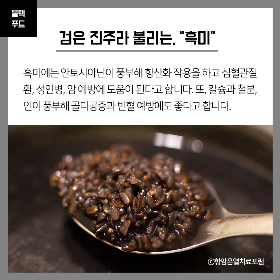 흑미에는 안토시아닌이 풍부해 항산화 작용을 하고 심혈관질환, 성인병, 암 예방에 도움이 된다고 합니다. 또, 칼슘과 철분, 인이 풍부해 골다공증과 빈혈 예방에도 좋다고 합니다.
