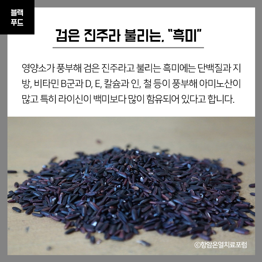 영양소가 풍부해 검은 진주라고 불리는 흑미에는 단백질과 지방, 비타민 B군과 D, E, 칼슘과 인, 철 등이 풍부해 아미노산이 많고 특히 라이신이 백미보다 많이 함유되어 있다고 합니다.