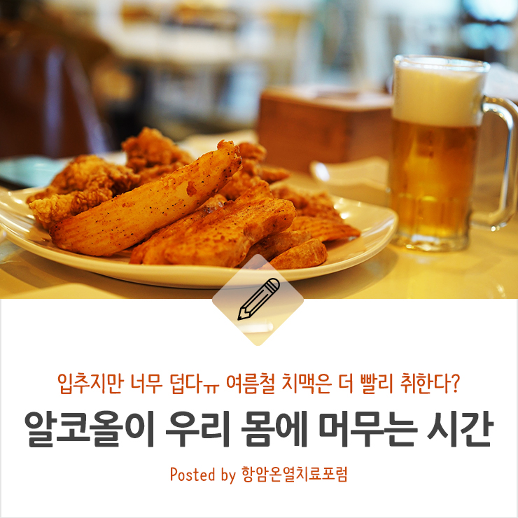 여름에는 온도와 습도가 높아 땀이 많이 흘리기 때문에 몸에 수분과 전해질이 부족해지기 쉽습니다. 우리 몸은 체온 조절을 위해 말초 혈관이 확장되는데 술을 마시면 더욱 확장된다고 해요. 이 때문에 알코올 흡수가 빨라지게 되어 혈중알코올농도는 더 빠르게 올라갑니다. 이런 이유로 같은 양의 알코올을 섭취해도 다른 계절보다 더 빨리 취하게 됩니다. 알코올은 이뇨작용을 활발하게 해 많은 수분과, 미네랄, 전해질을 더 배출하게 됩니다. 더운 날 술은 더 빨리 취할 수 있으므로 가볍게 기분 좋을 정도로만 마시도록 하고, 마실 때는 수분을 자주 보충해주세요.