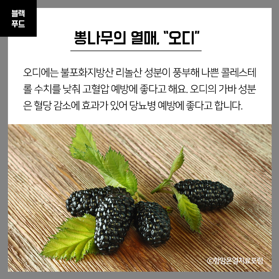 오디의 검은색을 내는 안토시아닌 성분은 항산화 작용을 하여 노화 방지, 시력 개선 효과에 도움을 준다고 합니다.