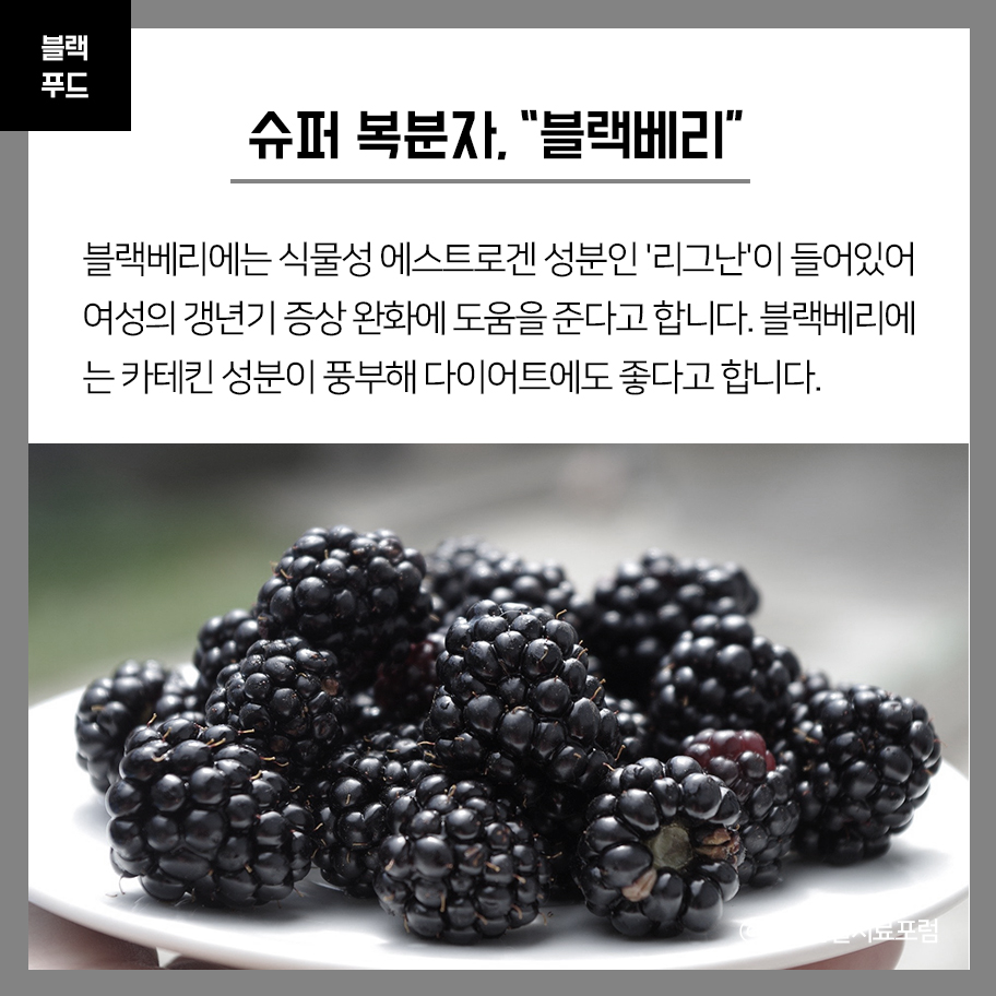 블랙베리에는 식물성 에스트로겐 성분인 '리그난'이 들어있어 여성의 갱년기 증상 완화에 도움을 준다고 합니다.