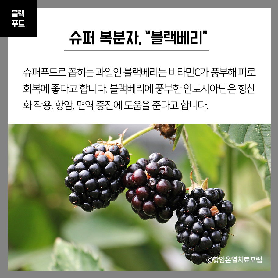 슈퍼푸드로 꼽히는 과일인 블랙베리는 비타민C가 풍부해 피로회복에 좋다고 합니다. 블랙베리에 풍부한 안토시아닌은 항산화 작용, 항암, 면역 증진에 도움을 준다고 합니다.
