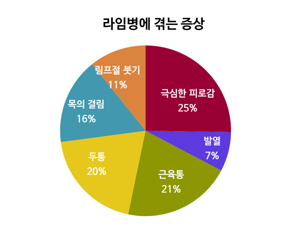 라임병을 경험한 환자를 조사한 결과 피로감 54%, 발열: 16%, 근육통: 44%, 두통: 42%, 목의 뻣뻣함(결림) 35%, 림프절 붓기: 23%를 경험한 것으로 나타났다고 하는데요. 라임병의 상세한 증상을 살펴보자면 다음과 같습니다.