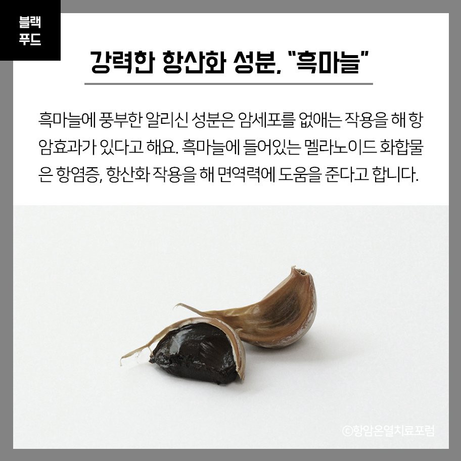 흑마늘에 풍부한 알리신 성분은 암세포를 없애는 작용을 해 항암효과가 있다고 해요.