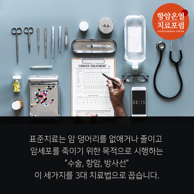 표준치료는 암 덩어리를 없애거나 줄이고 암세포를 죽이기 위한 목적으로 시행하는 "수술, 항암, 방사선"이 세가지를 3대 치료법으로 꼽습니다.