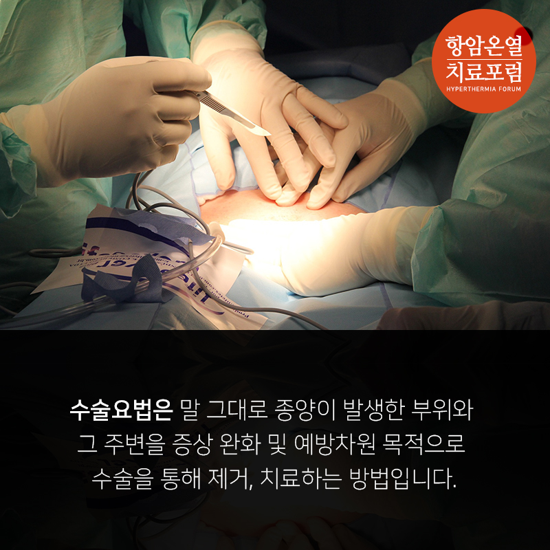 수술요법은 말 그대로 종양이 발생한 부위와 그 주변을 증상 완화 및 예방차원 목적으로 수술을 통해 제거, 치료하는 방법입니다.