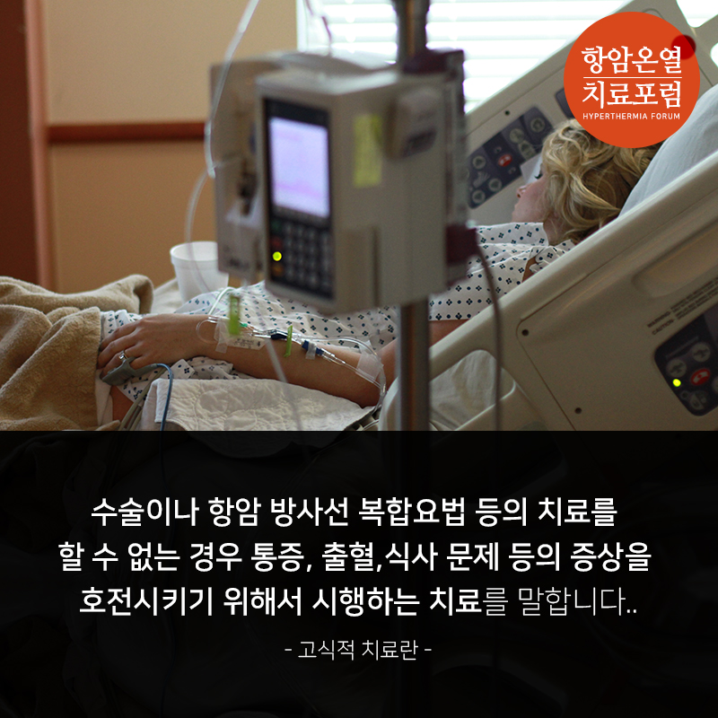 암을 치료하는데 있어 표준치료라는 말외에도 고식적 치료라는 말이 쓰이기도하는데, 수술 시 암종을 완전히 절제할 수 없거나 원격전이가 있어 근치적 목적의 수술이나 항암 방사선 복합요법 등의 치료를 할 수 없는 경우 통증, 출혈, 식사 문제 등의 증상을 호전시키기 위해서 시행하는 치료를 말합니다.