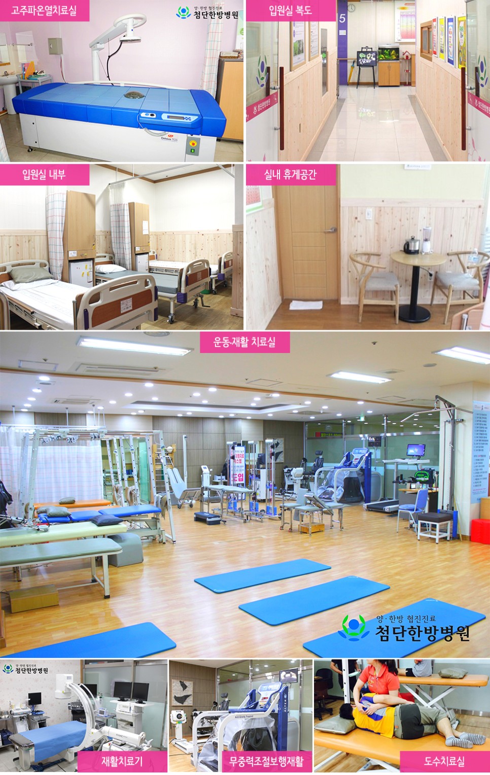 사진을 통해 내부시설을 간단히 소개하자면, 고주파온열치료실, 피톤치드가 뿜뿜 편백나무(히노끼)가 가까이에 있는 입원실과 휴게실. 그리고 운동재활치료실, 도수재활치료실, 무중력조절보행재활시스템 등을 볼 수 있습니다.