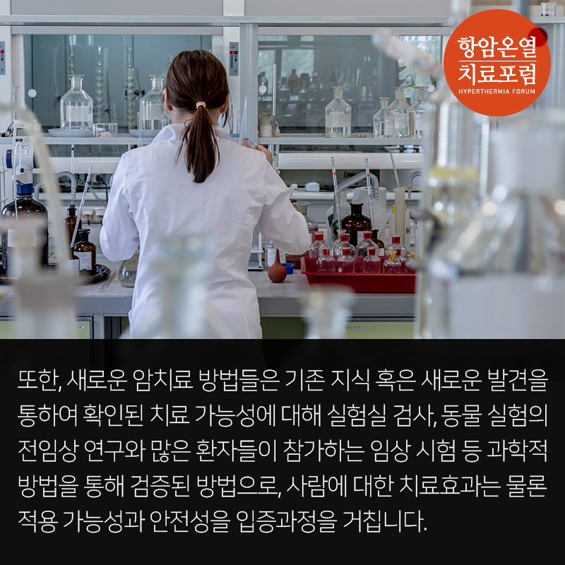 또한, 새로운 암치료 방법들은 기존 지식 혹은 새로운 발견을통하여 확인된 치료 가능성에 대해 실험실 검사, 동물 실험의 전임상 연구와 많은 환자들이 참가하는 임상 시험 등 과학적 방법을 통해 검증된 방법으로, 사람에 대한 치료효과는 물론 적용 가능성과 안전성을 입증과정을 거칩니다.