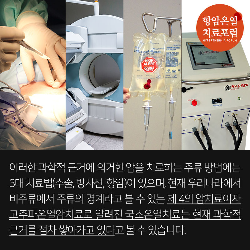 이러한 과학적 근거에 의거한 암을 치료하는 주류 방법에는 3대 치료법(수술, 방사선, 항암)이 있으며, 현재 우리나라에서 비주류에서 주류의 경계라고 볼 수 있는 제 4의 암치료이자 고주파온열암치료로 알려진 국소온열치료는 현재 과학적 근거를 점차 쌓아가고 있다고 볼 수 있습니다.