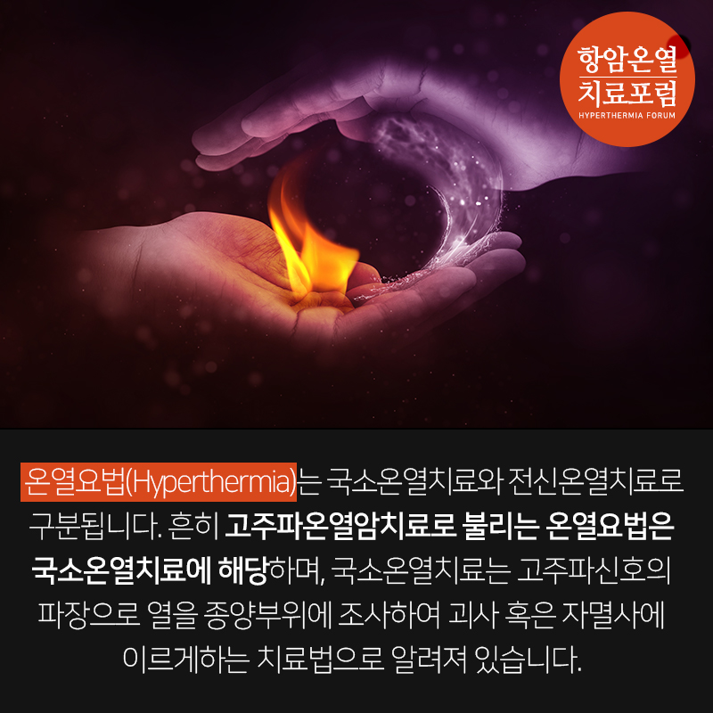 온열요법(Hyperthermia)는 국소온열치료와 전신온열치료로 구분됩니다. 흔히 고주파온열암치료로 불리는 온열요법은 국소온열치료에 해당하며, 국소온열치료는 고주파신호의 파장으로 열을 종양부위에 조사하여 괴사 혹은 자멸사에 이르게하는 치료법으로 알려져 있습니다.