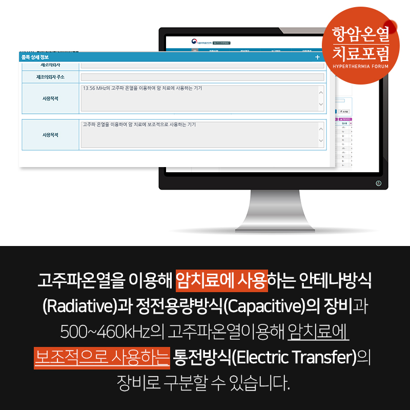 500~460kHz의 고주파온열이용해 암치료에 보조적으로 사용하는 통전방식(Electric transfer)의 장비로 구분할 수 있습니다.