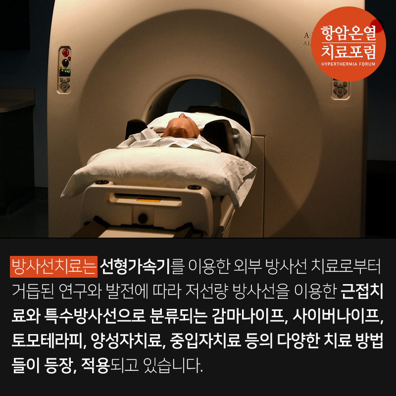 방사선치료는 선형가속기를 이용한 외부 방사선 치료로부터 거듭된 연구와 발전에 따라 저선량 방사선을 이용한 근접치료와 특수방사선으로 분류되는 감마나이프, 사이버나이프, 토모테라피, 양성자치료, 중입자치료 등의 다양한 치료 방법 들이 등장, 적용되고 있습니다.